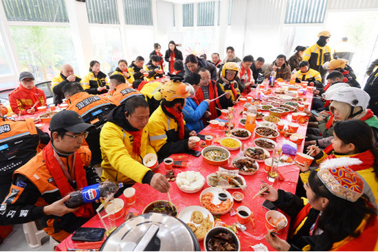 活動尾聲,工作人員為每位“小哥”送上了裝有春聯(lián)、福字、保暖手套及干糧的“暖冬禮包”。熱氣騰騰的團圓飯,笑語盈盈的相聚場景,讓這座城市的“奔跑者”們在寒冬里倍感溫暖。(陳周璇)