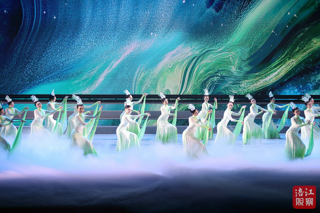 舞蹈《玉·如意》中,淡綠衣袂的舞者與藍(lán)綠云紋背景渾然一體,恍若將富樂山的晨霧穿在了身上;