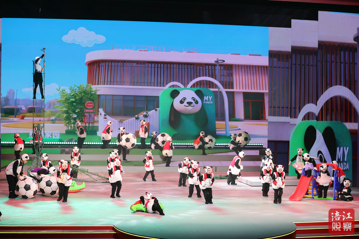 少兒歌舞《你好呀!朋友》中熊貓裝扮的孩童在足球道具間嬉戲,童稚笑聲穿透屏幕直抵人心;