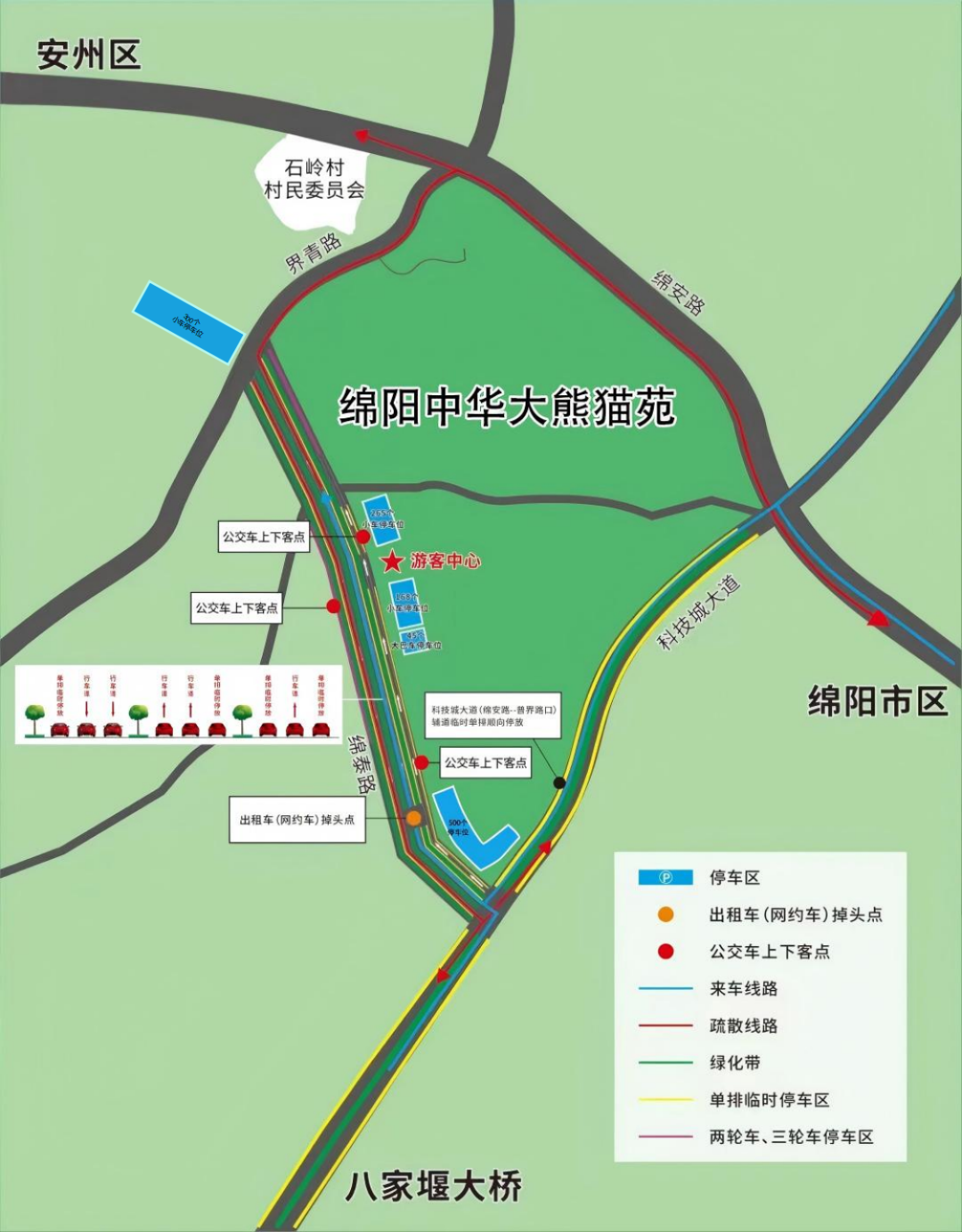 針對(duì)自駕需要停車的游客,綿陽(yáng)中華大熊貓?jiān)?strong>新增4號(hào)停車場(chǎng)提供500個(gè)車位;新增臨時(shí)停車場(chǎng)提供300個(gè)車位;熊貓大道兩側(cè)春節(jié)期間可停放車輛,可滿足1000余輛小型車輛停車需求。加上原有三個(gè)停車場(chǎng),共計(jì)可提供3000余個(gè)停車位,所有車位均免費(fèi)停放。