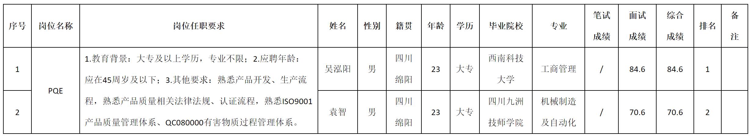 根據(jù)四川九州電子科技股份有限公司發(fā)布的招聘公告及招聘相關(guān)規(guī)定,現(xiàn)將測試成績予以公示。
