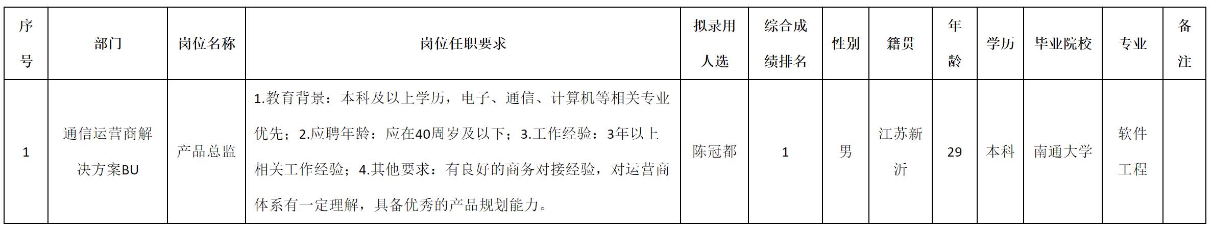 根據(jù)四川九州電子科技股份有限公司發(fā)布的招聘公告及招聘相關(guān)規(guī)定,經(jīng)測試、考察、體檢等程序,擬錄用陳冠都同志到四川九州電子科技股份有限公司工作,現(xiàn)予以公示,具體情況如下: