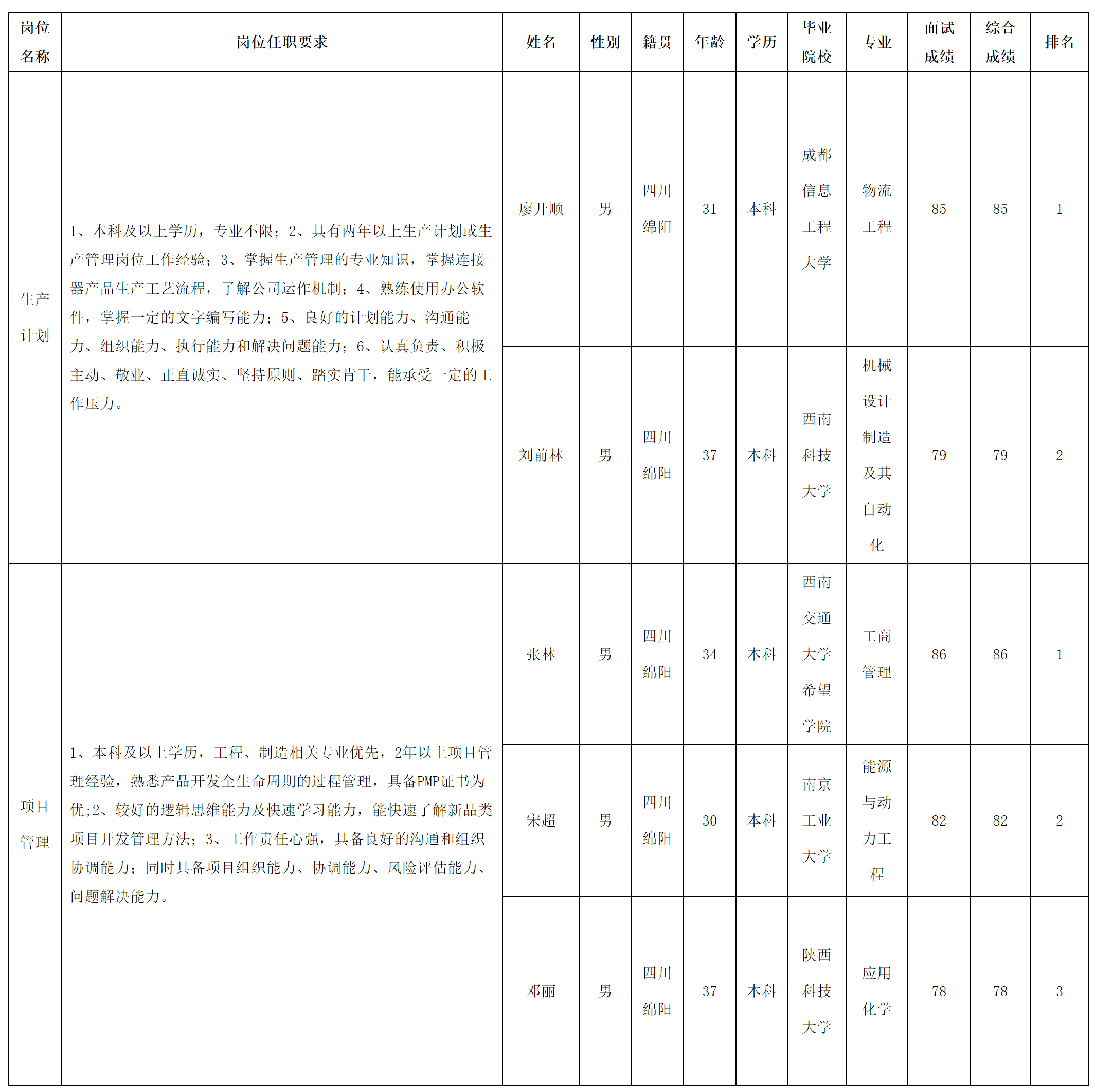根據(jù)四川華豐科技股份有限公司發(fā)布的招聘公告及招聘相關(guān)規(guī)定,經(jīng)面試等程序,現(xiàn)將測(cè)試成績(jī)予以公示。