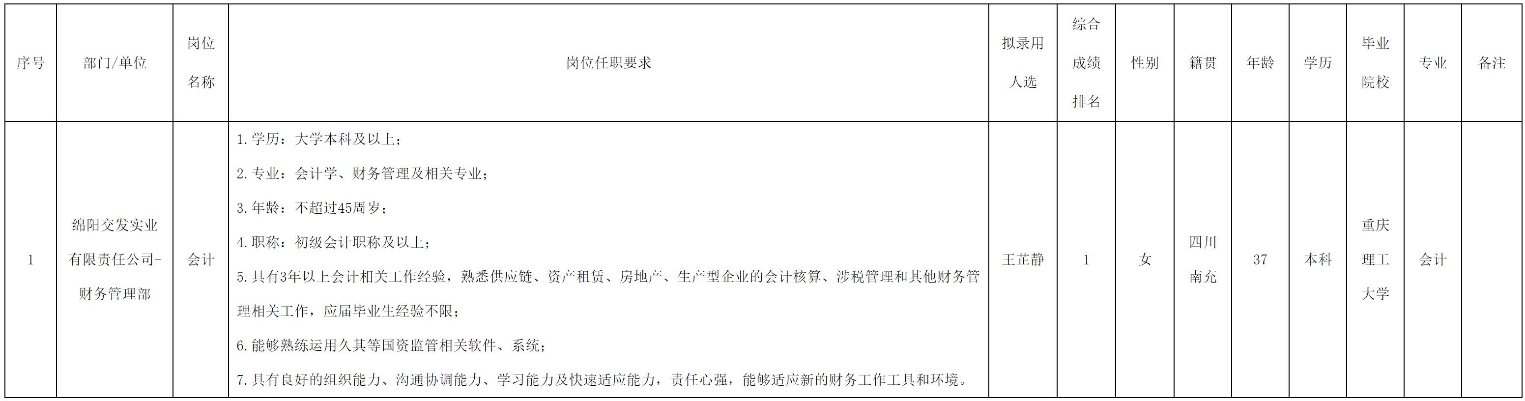 根據(jù)交發(fā)實(shí)業(yè)發(fā)布的招聘公告及招聘相關(guān)規(guī)定,經(jīng)筆試、面試、體檢等程序,擬錄用王芷靜到交發(fā)實(shí)業(yè)公司工作?,F(xiàn)予以公示,具體情況如下: