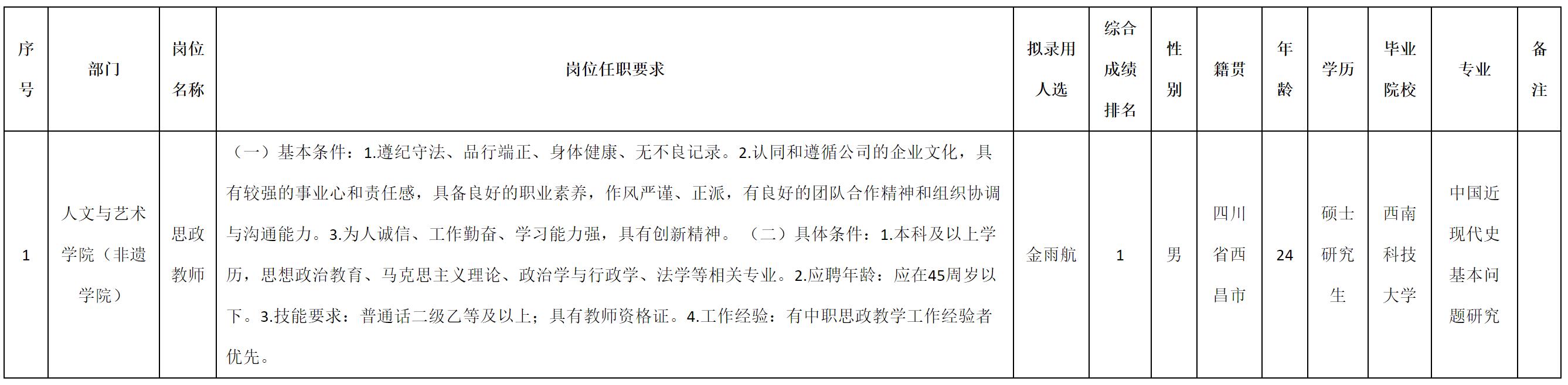 根據(jù)四川九洲教育投資管理有限公司發(fā)布的招聘公告及招聘相關(guān)規(guī)定,經(jīng)測(cè)試、考察、體檢等程序,擬錄用金雨航同志到四川九洲教育投資管理有限公司工作,現(xiàn)予以公示,具體情況如下: