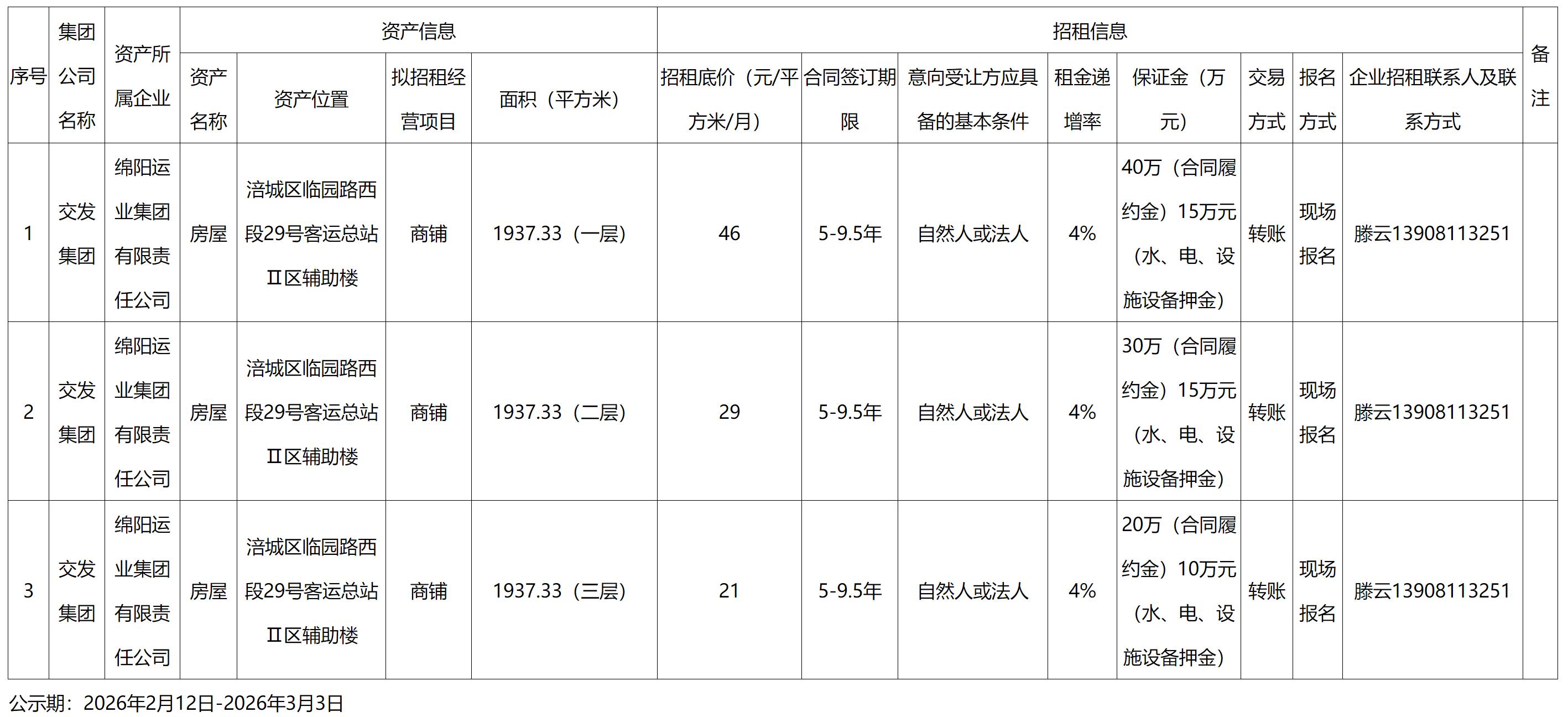 綿陽(yáng)運(yùn)業(yè)集團(tuán)有限責(zé)任公司資產(chǎn)出租公告