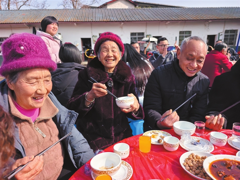 正午時分,“團圓壩壩宴”正式開席。紅燒魚、咸燒白、回鍋肉、粉蒸肉、酥肉湯……菜品陸續(xù)上桌,熱氣騰騰、香氣四溢。王伯會數(shù)了數(shù),雞鴨魚肉樣樣俱全,“比往年多好幾道菜呢!”