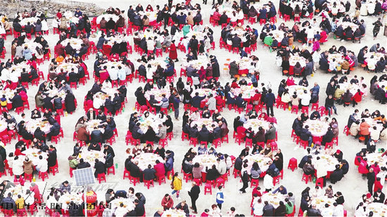 “上菜嘍……”隨著民宿主理人清亮的吆喝聲,桑棗鎮(zhèn)“遇見棲心”民宿院壩里,100多張圓桌次第擺開。蒸燒白冒著熱氣、香碗里浮著金黃蛋餃、臘味拼盤油光發(fā)亮,連裝菜的土陶碗都透著年深日久的溫潤。“我們提前3天就開始備料,村民送來自家腌的香腸,民宿廚房掌勺,每道菜都帶著‘家的密碼’。”民宿主理人肖婷婷邊給游客布菜邊介紹道。