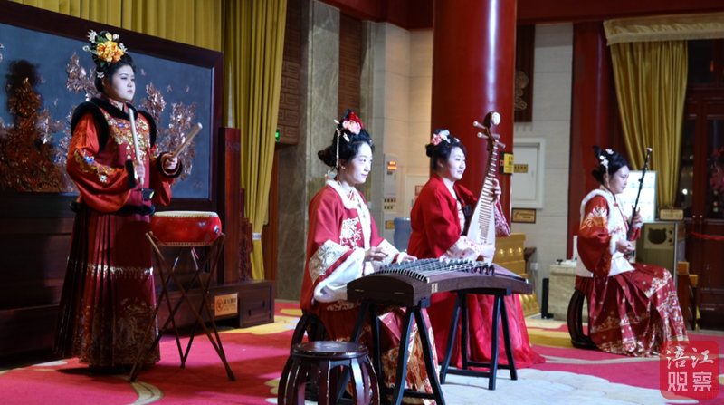 夜幕降臨,越王樓華燈璀璨、流光溢彩。二樓平臺上,黃梅戲、川劇變臉等非遺節(jié)目輪番上演,贏得陣陣掌聲;十五樓展廳內(nèi),馬年主題民樂演奏如期開演,二胡、古箏合奏《賽馬》激昂奔放,奏響新春樂章。