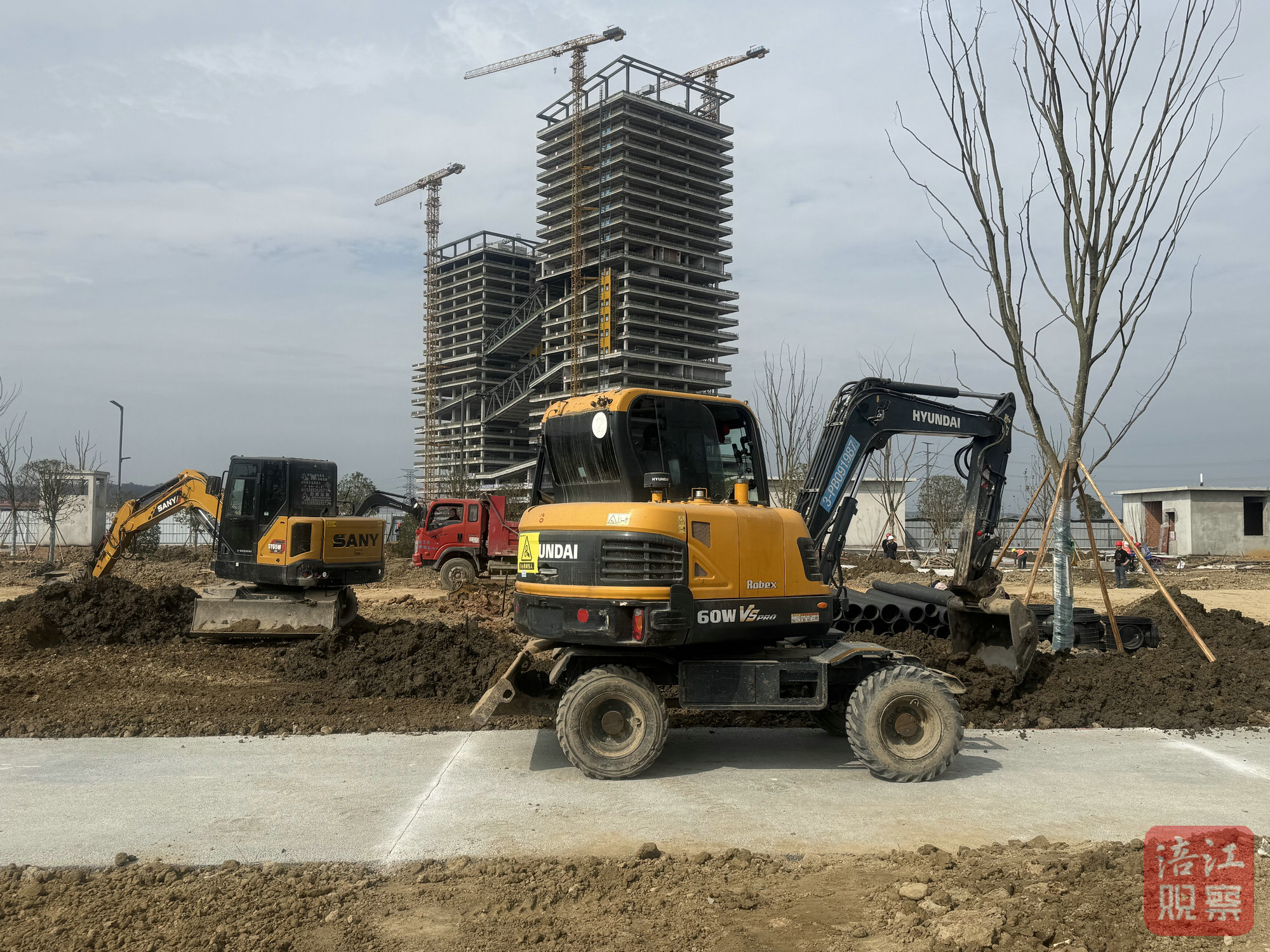 記者在現(xiàn)場看見,數(shù)十名施工人員佩戴好安全帽忙碌在各個角落,挖掘機、渣土車等工程車輛往來穿梭,主體施工區(qū)域的作業(yè)面全面鋪開,一派繁忙景象。