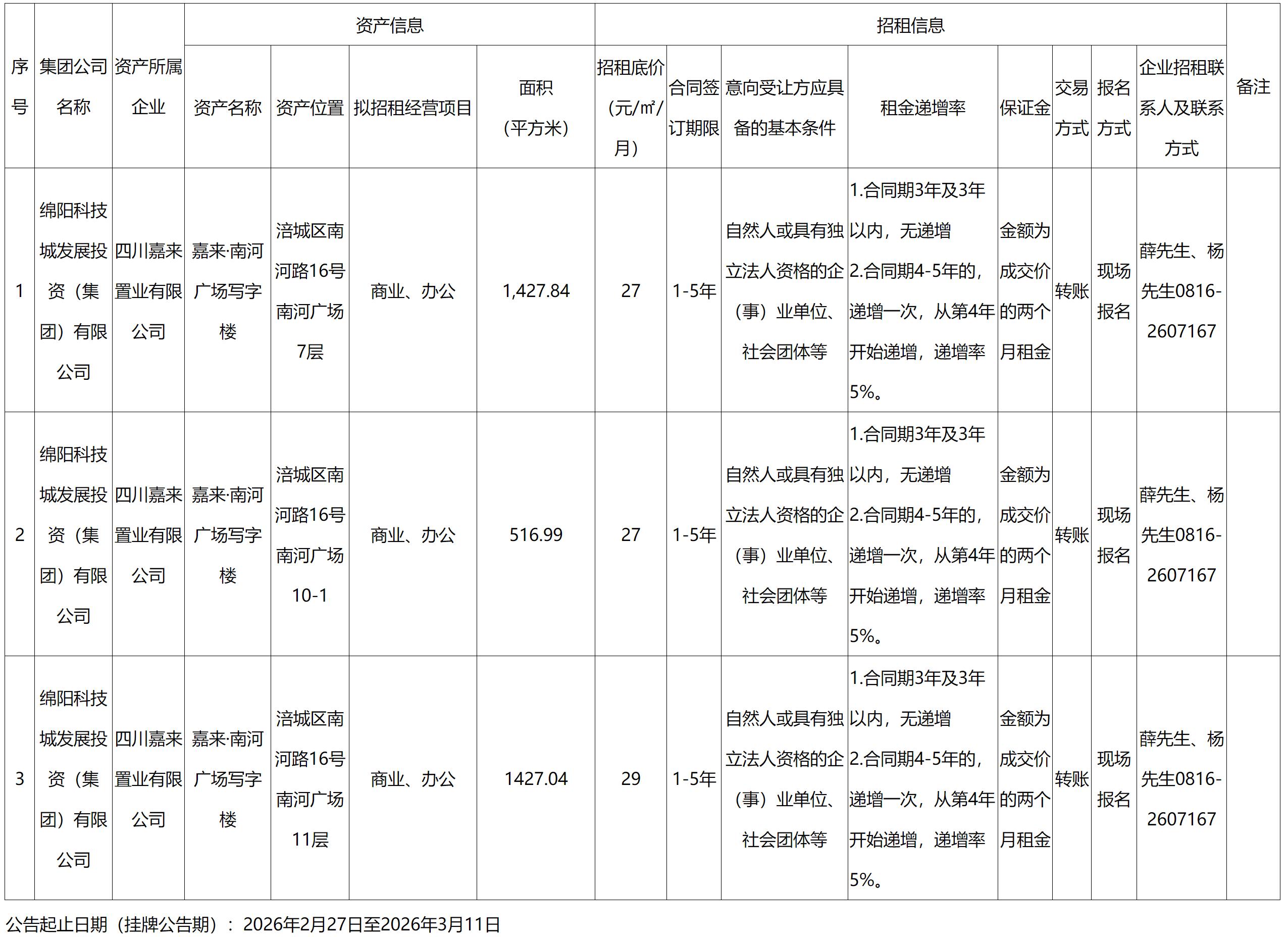 四川嘉來置業(yè)有限公司資產(chǎn)出租公告
