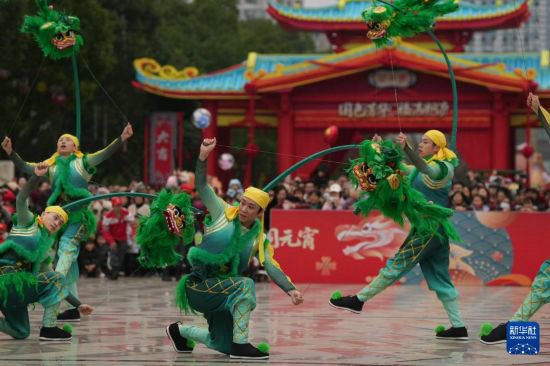 2月28日,廣東揭陽青獅表演隊(duì)在桐廬縣中心廣場(chǎng)巡游表演。