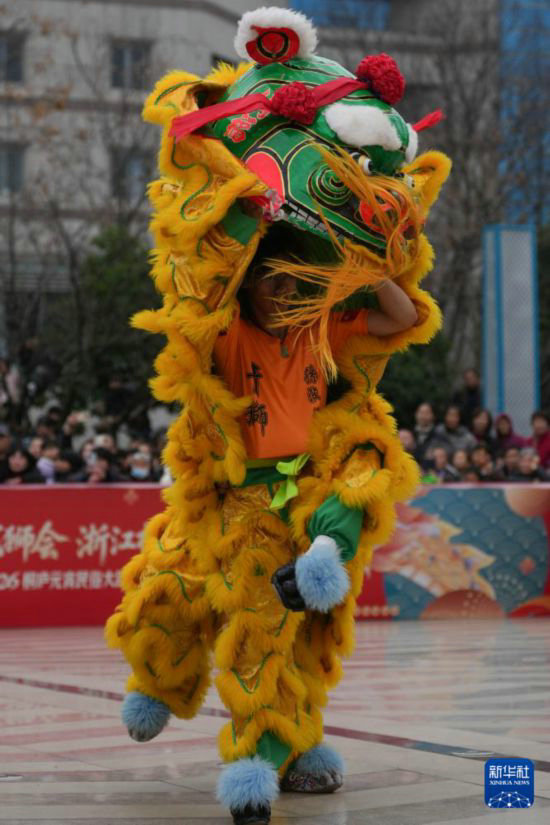 2月28日,桐廬縣深澳高空獅子表演隊(duì)在桐廬縣中心廣場(chǎng)巡游表演。