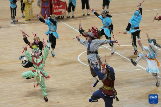 2月28日,來自廣東潮汕地區(qū)的英歌舞表演隊(duì)在江南體育館表演。