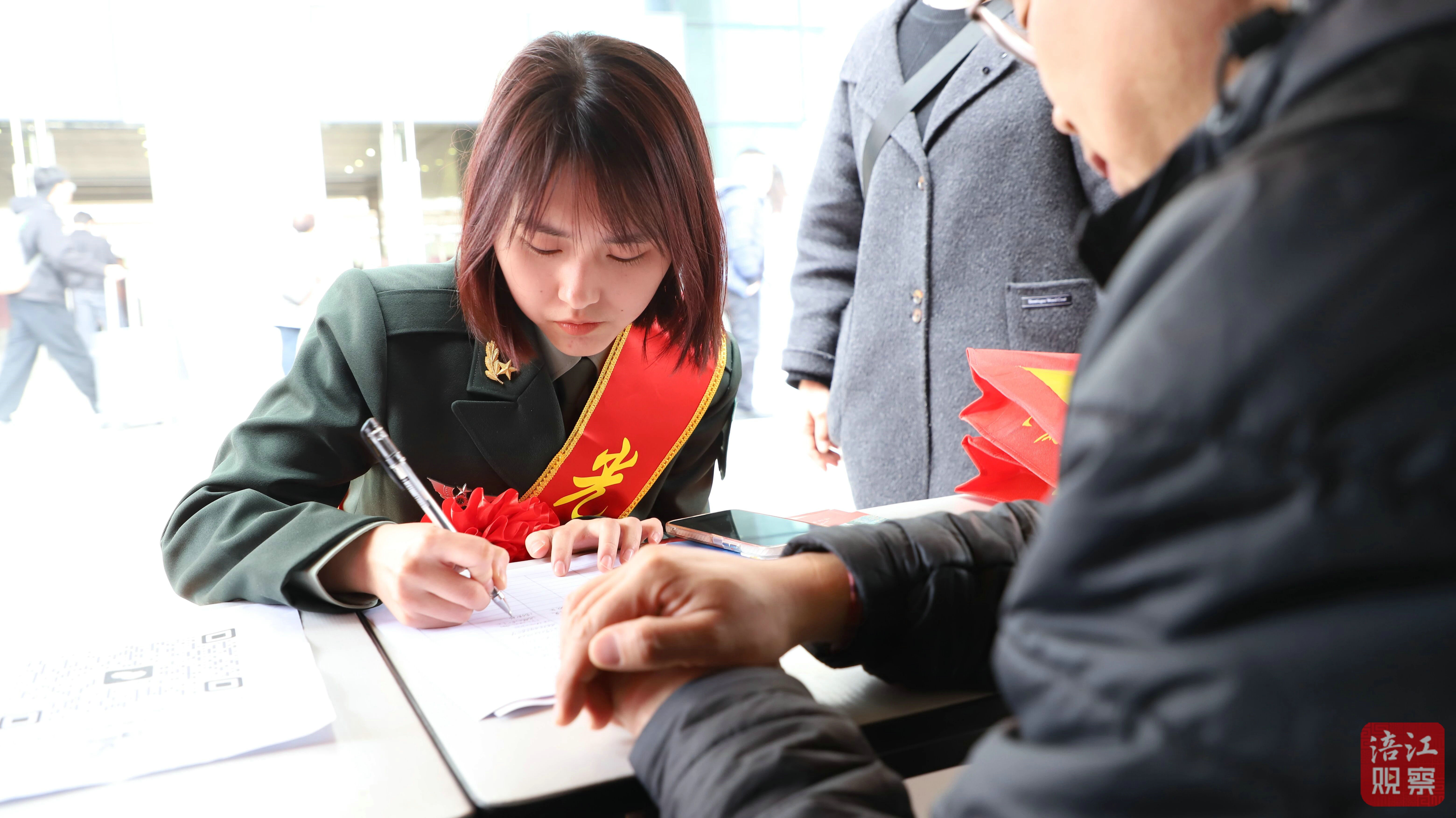 此外,為迎接退役軍人,現(xiàn)場(chǎng)還提供了“戎耀返鄉(xiāng)專車”,免費(fèi)送退役軍人們平安回家。