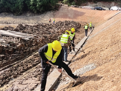 鵝溪鎮(zhèn)長壽村山坪塘整治現(xiàn)場,工人們正在砌筑護(hù)坡。 葉亮亮 攝