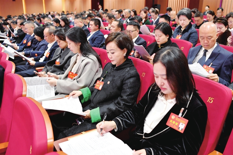 出席市八屆人大六次會議的代表認真聽取政府工作報告。 記者 王勇 攝