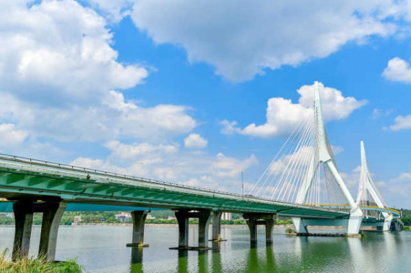 5月28日,綿陽(yáng)天空湛藍(lán),白云悠然飄蕩,三江大橋橫跨在涪江之上,雄偉又壯觀。 [