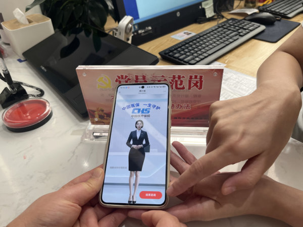 6月16日,在市政務(wù)服務(wù)中心醫(yī)保窗口前,市民薛志峰正陪同家人辦理靈活就業(yè)人員參保手續(xù),工作人員向他推薦了近期上線的“綿小?!盇I數(shù)字人。[
