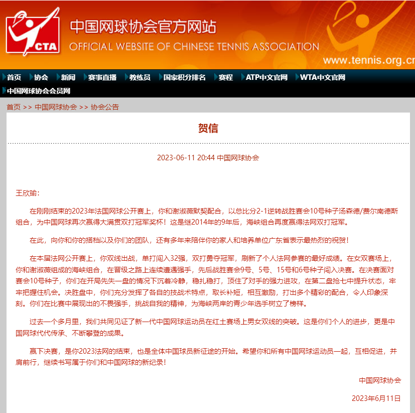 11日,在王欣瑜和謝淑薇奪得法國網(wǎng)球公開賽女雙冠軍之后,中國網(wǎng)球協(xié)會向王欣瑜發(fā)出了賀信。 [