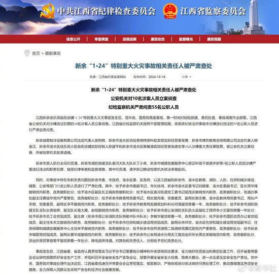 2024年1月24日15時22分,江西省新余市渝水區(qū)佳樂苑小區(qū)臨街商住綜合樓發(fā)生特別重大火災(zāi)事故。江西省公安機關(guān)對涉嫌違法犯罪的10名涉案人員立案偵查。江西省紀(jì)檢監(jiān)察機關(guān)按照干部管理權(quán)限,依規(guī)依紀(jì)依法對事故中涉嫌違紀(jì)違法的55名公職人員進(jìn)行嚴(yán)肅追責(zé)問責(zé)。[