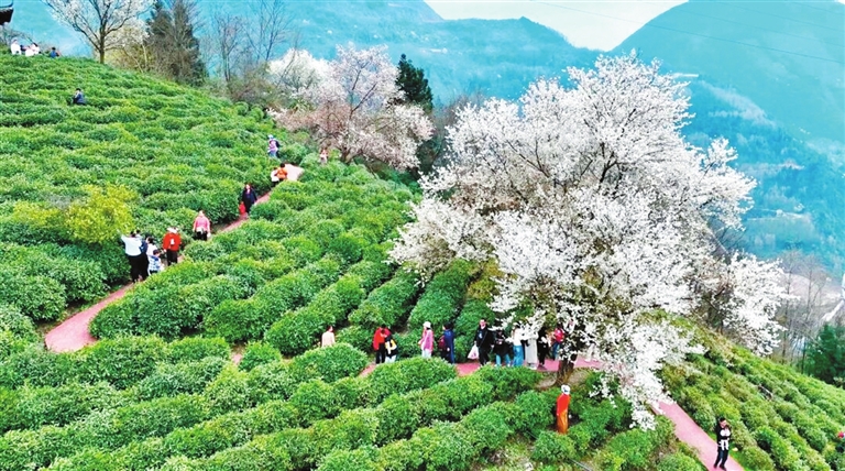 三千畝茶園吐新芽、兩千余株櫻花盛放。北川擂鼓鎮(zhèn)蓋頭山形成“云霞落坡”的獨(dú)特春日景觀,視覺效果極佳、拍照出片。新增觀景棧道,推出采茶、手工制茶、櫻花樹下圍爐煮茶等沉浸式體驗(yàn),游客不再“走馬觀花” [